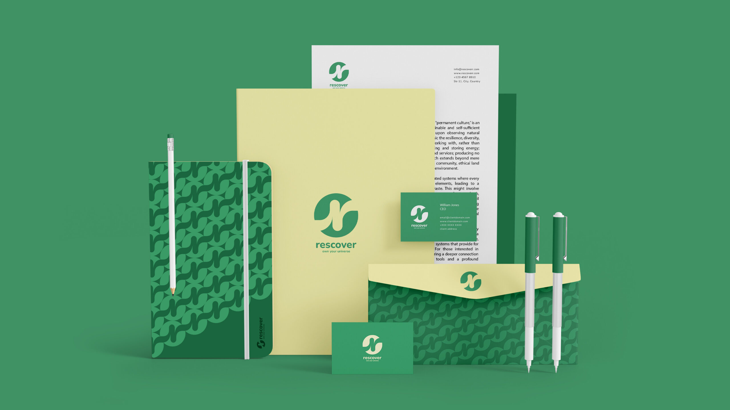 The Rescover company has a ”cycle” and the two Rs from the ”rescover” word represent the cycle. The refurbishing, recycling, reusing old items and growing food with permaculture are ”cycles” which is reflected by the name ”rescover” with two ”R”s at the beginning and the end of the word. One of the Rs is connected upside down to the other it showing people’s connection, and the green circle behind the Rs is the symbol of the environment and universe; the Rs are in front of the green circle, it’s like they embrace it and protect it.